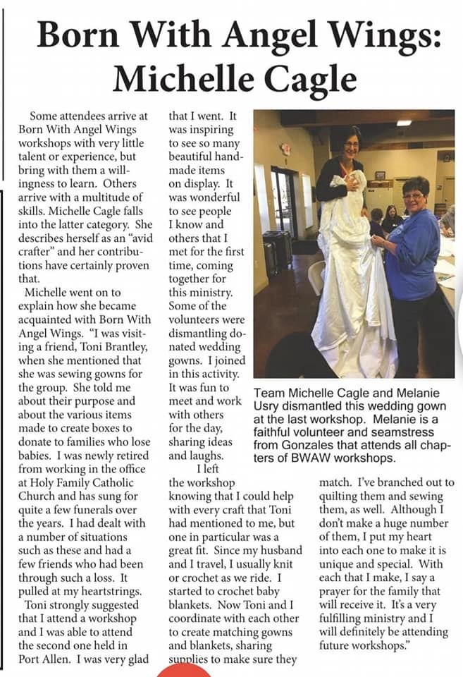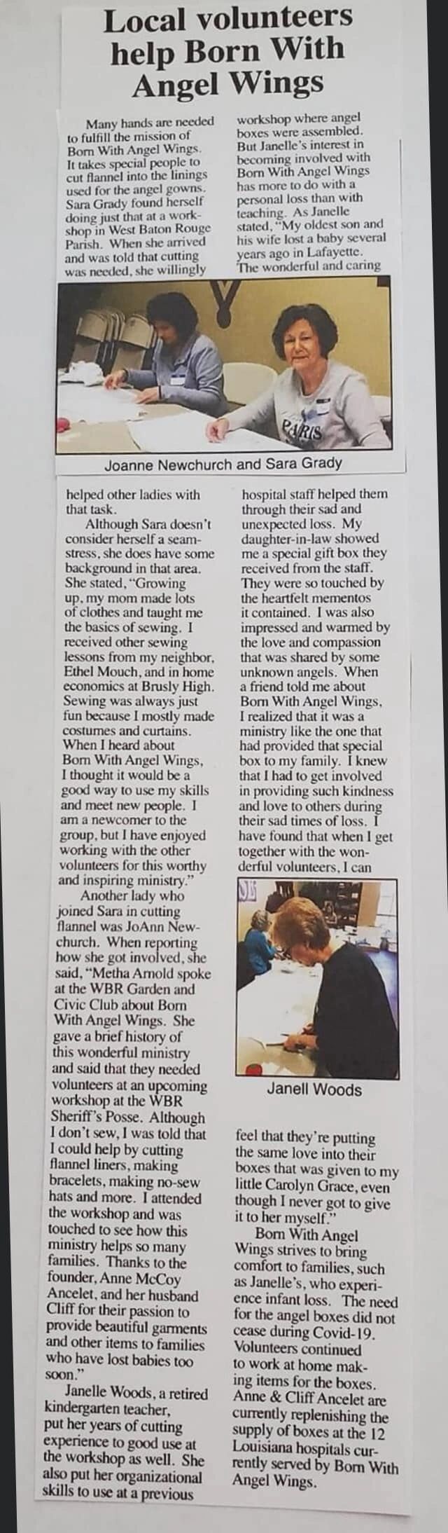 Anne & Cliff Ancelet would like to thank the Knights of Columbus for the use of their hall. They would also like the community to know that an Angel Box can be requested directly from them if a family does not have access to one from a hospital or funeral home. Contact information can be found on the Born With Angel Wings Facebook page or at bornwithangelwings.com. Anyone interested in volunteering or making a donation are asked to send a message through the Facebook page. Anne Ancelet often says that it takes a village to dress the baby angels for Heaven. West Baton Rouge has an amazing village of volunteers who work tirelessly and generously toward this end. Offers to donate wedding gowns are appreciated, but are still not being accepted at this time due to covid.
